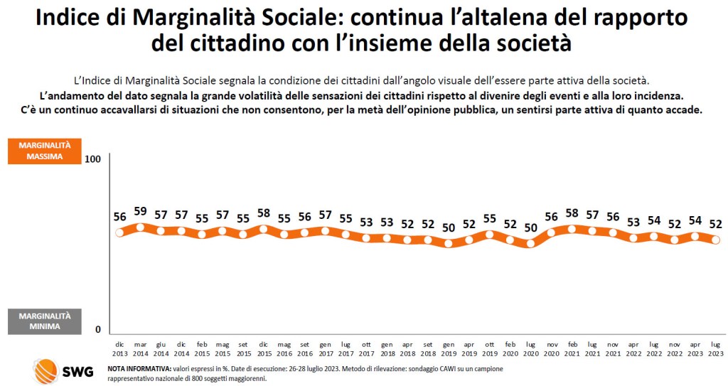 Notare il particolare generale del grafico sulla marginalità sociale: mai da dicembre 2013 e da marzo 2014, l’indice è sceso al di sotto di 50. Al contrario, se fosse avvenuto avrebbe indicato che in quegli istanti, con quel punteggio, i nostri connazionali si erano sentiti meno in balia degli eventi, meno impotenti.