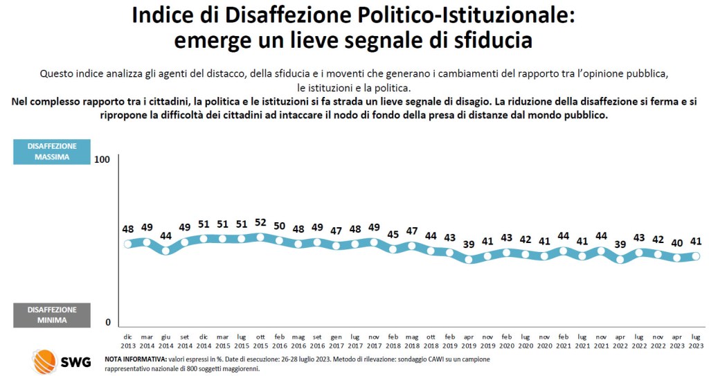 Nel breve periodo, quello di aprile-luglio 2023, la disaffezione è risalita di un punto (quota 41% dei sondati).
