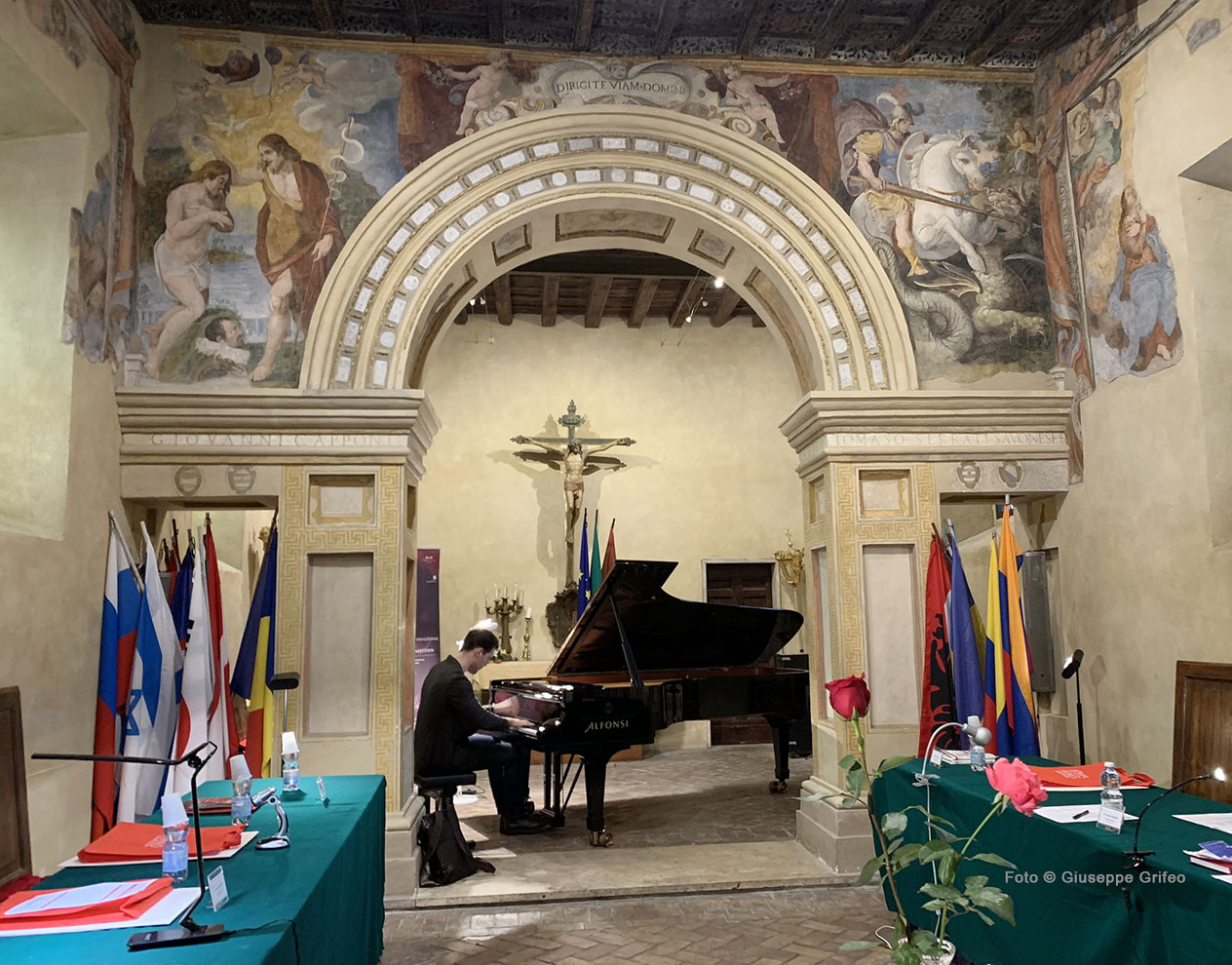 Marcella Crudeli – Organizzare un concorso non è facile, soprattutto in una città così sterminata come Roma dove tutto è più dispersivo. Da tanti anni abbiamo trovato questa magnifica Confraternita dei Genovesi che ci ospita in questo oratorio a Trastevere, ma non solo qui: abbiamo a disposizione tutte le sale splendidamente affrescate dove i ragazzi trovano i pianoforti portati da Alfonsi per poter studiare prima delle singole esibizioni. Una situazione preziosa che ci permette di avere un centro unico di preparazione e svolgimento delle prove in una metropoli enorme come è Roma.