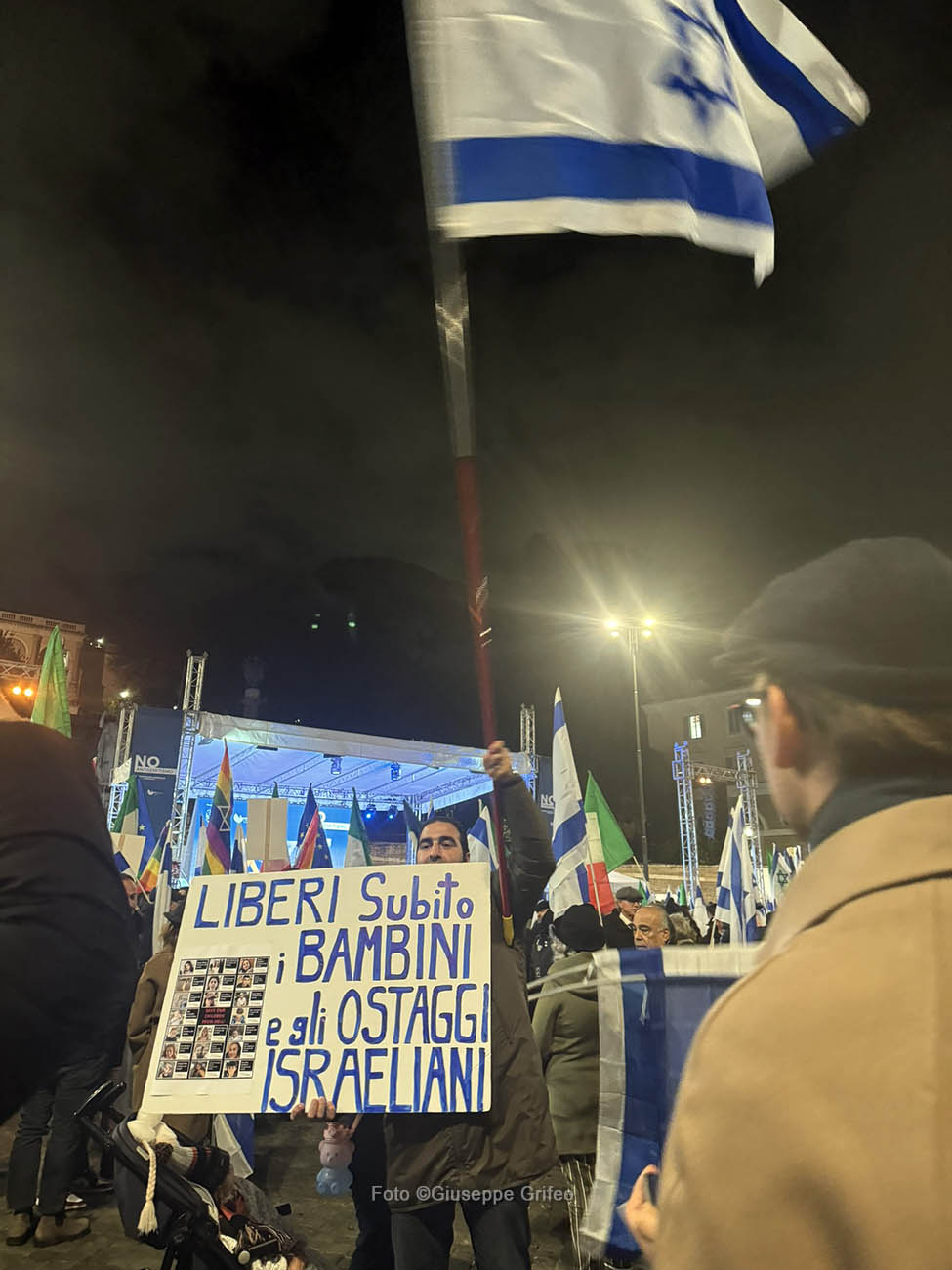 Una foresta di bandiere con le diverse caratterizzazioni, cartelli che invocavano la libertà per gli ostaggi, cittadini israeliani e non, che sono ancora nelle mani di Hamas, dei bambini che sono ancora segregati dai terroristi.