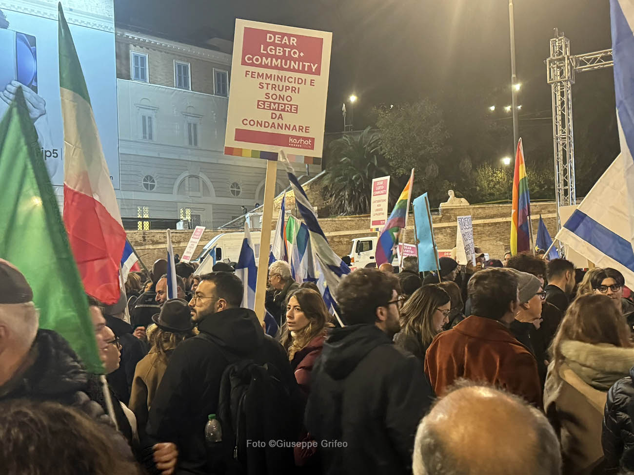 Dal palco della manifestazione Victor Fadlun, presidente della Comunità ebraica di Roma, Noemi Di Segni, presidente dell’Unione delle Comunità ebraiche italiane e Sara Levi Sacerdotti, della Comunità ebraica di Torino, che ha lanciato un appello alle associazioni femministe tenendo presenti le donne uccise, violentate ed esposte nude come trofei nell’attacco del 7 ottobre: “Che credibilità ha un’associazione femminista se non riconosce come fattor comune indiscutibile e univoco un femminicidio di massa, forse il peggiore degli ultimi tempi?“.