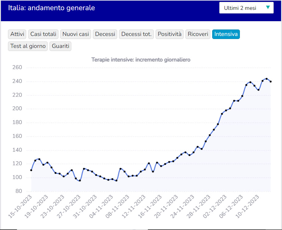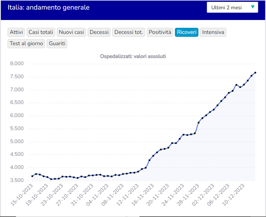 Secondo gli ultimi dati Italia del 19 dicembre 2020, negli ultimi sette giorni i ricoveri sono stati 7.292 per gli ospedalizzati registrando un +13.5%. In terapia intensiva ci sono finiti in 237.