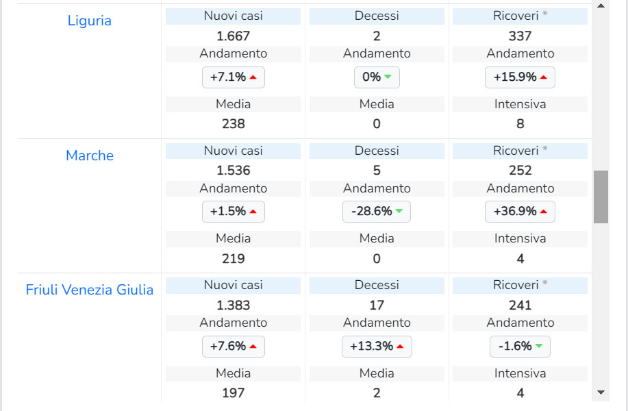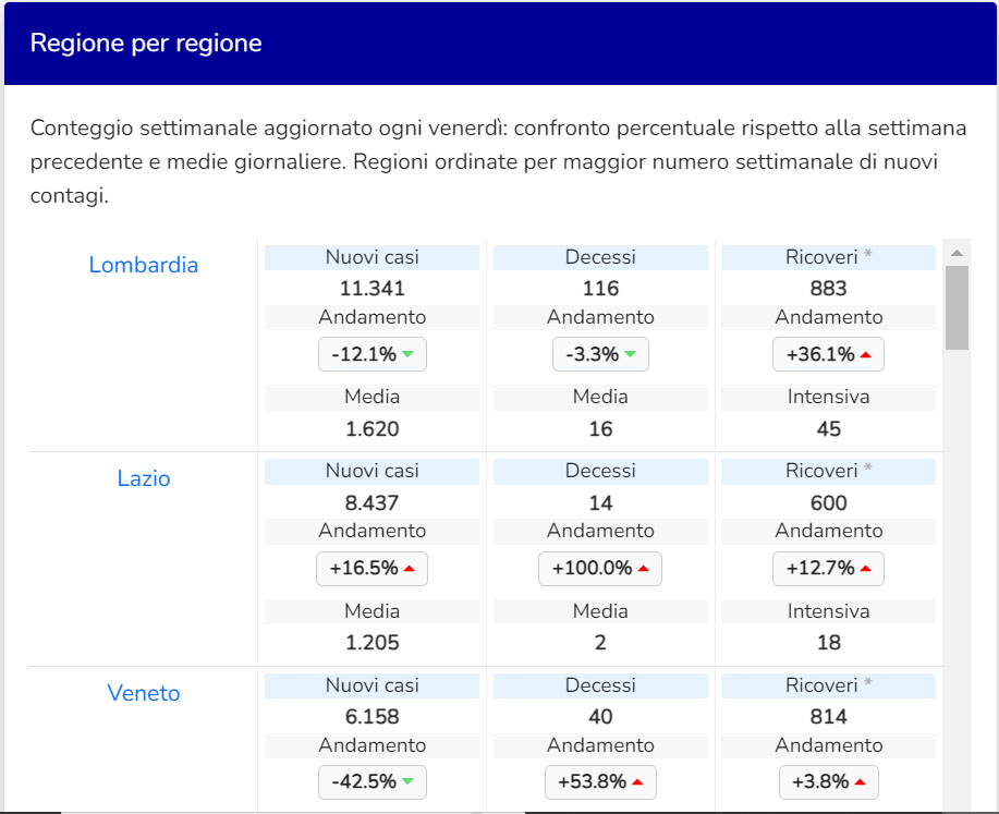Qui in basso i riquadri sulla situazione delle diverse regioni italiane. Stessa fonte. La Lombardia è al vertice per massimo numero di nuovi casi (già il doppio della terza in classifica che è il Veneto), per decessi e per ricoveri.