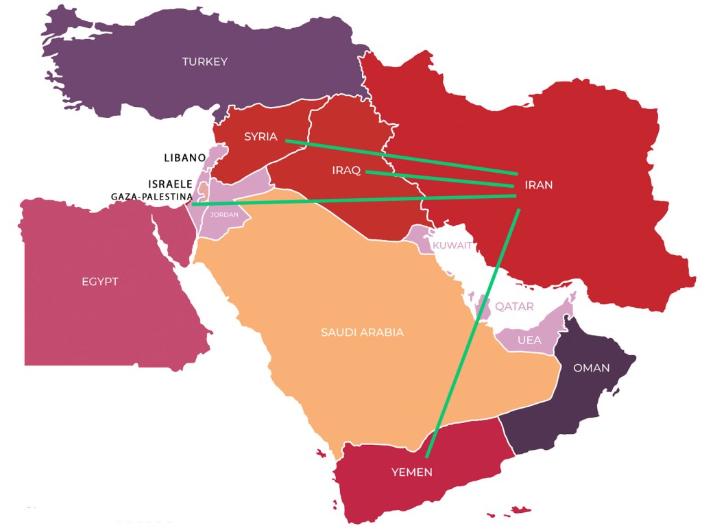 Iraq, Siria e Yemen rientrano nella strategia realizzata dell’Iran per accerchiare politicamente e militarmente i regni sunniti. A quelle tre nazioni-satelliti degli ayatollah si affiancano le organizzazioni terroristiche e milizie di Hamas, Hezbollah, degli Houthi nello Yemen, l’esercito Quds-componente del Corpo delle Guardie della rivoluzione islamica utilizzata in operazioni fuori dal territorio dell’Iran.
