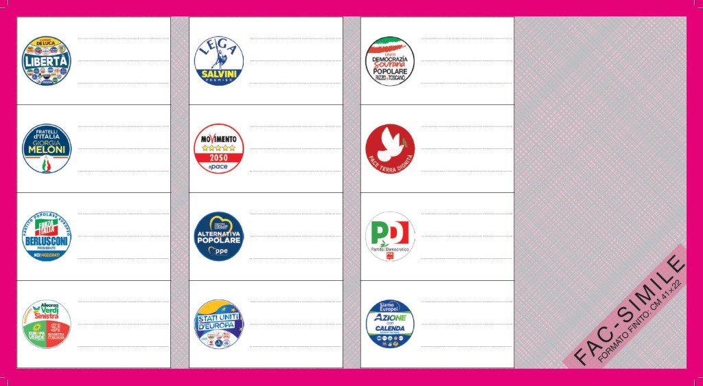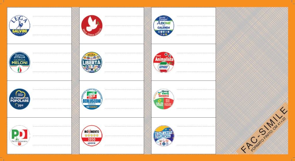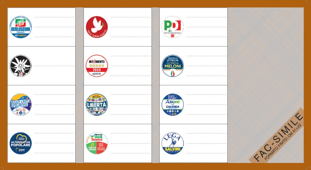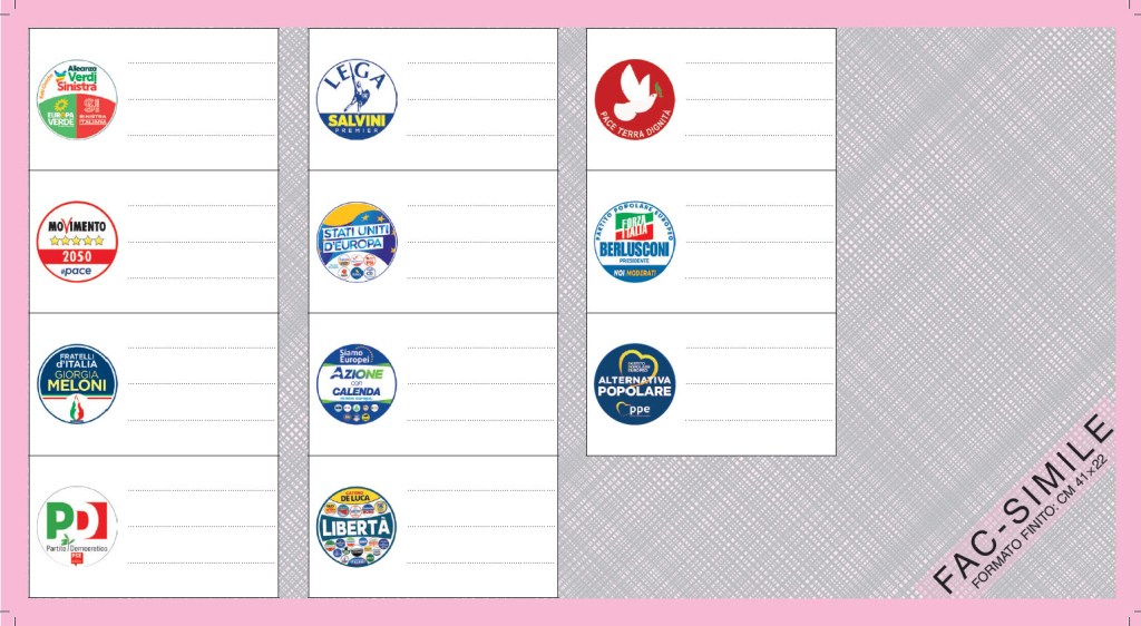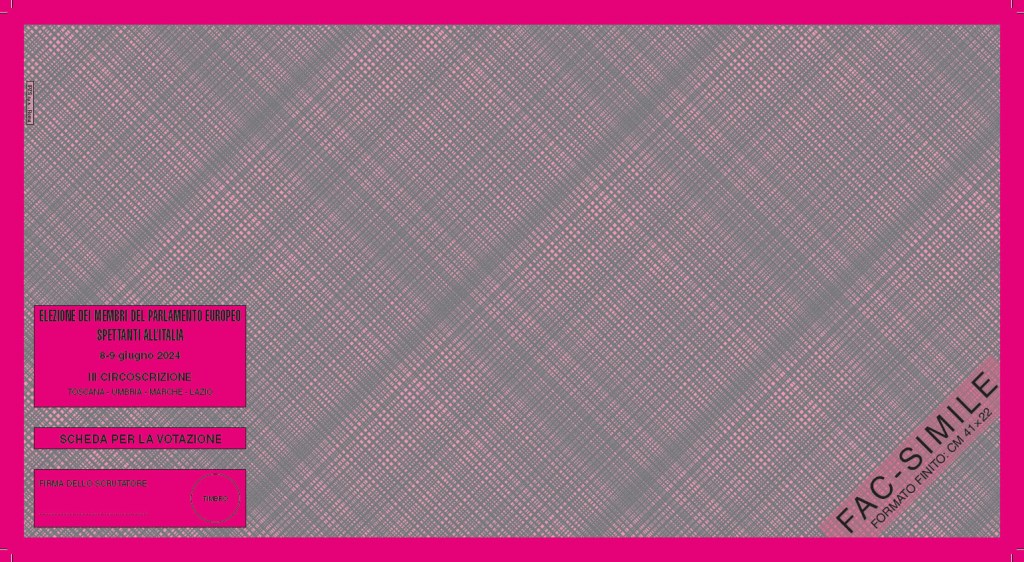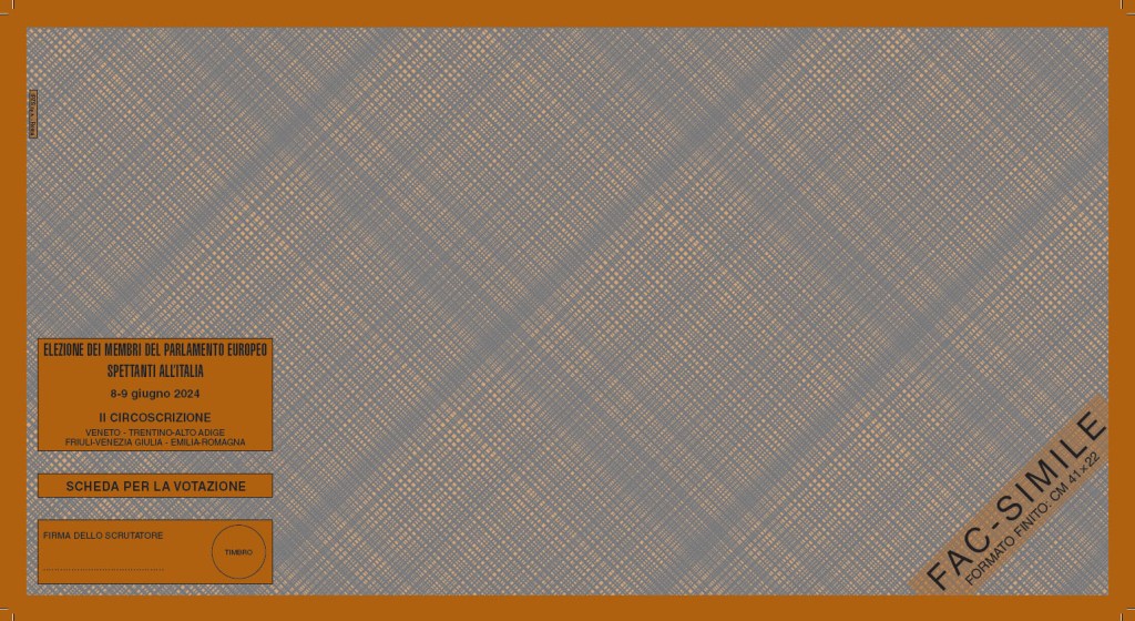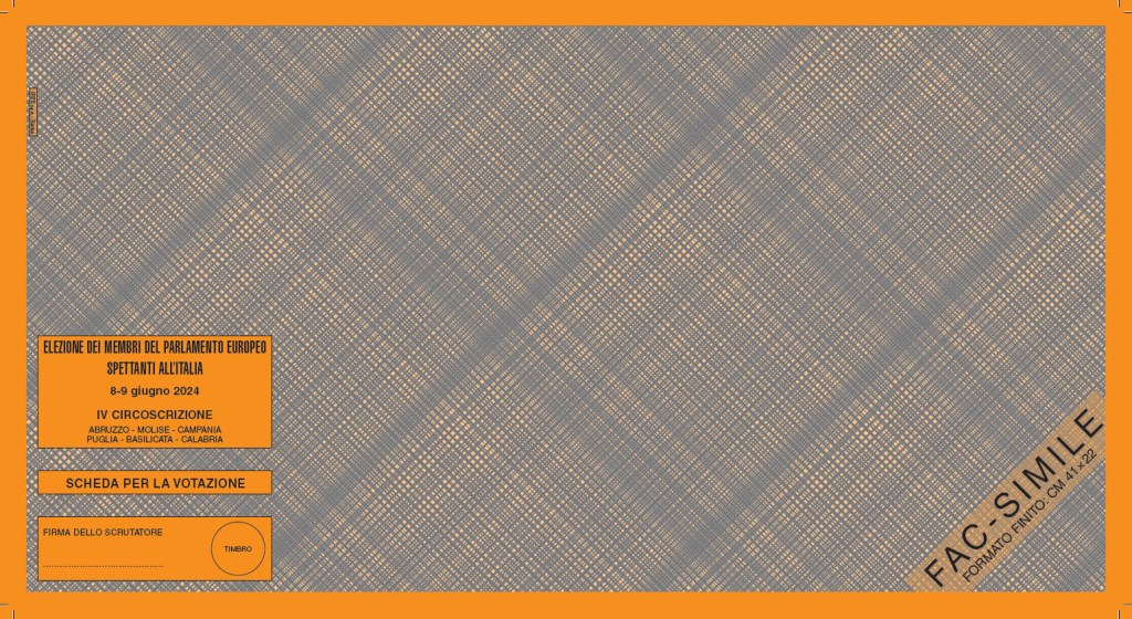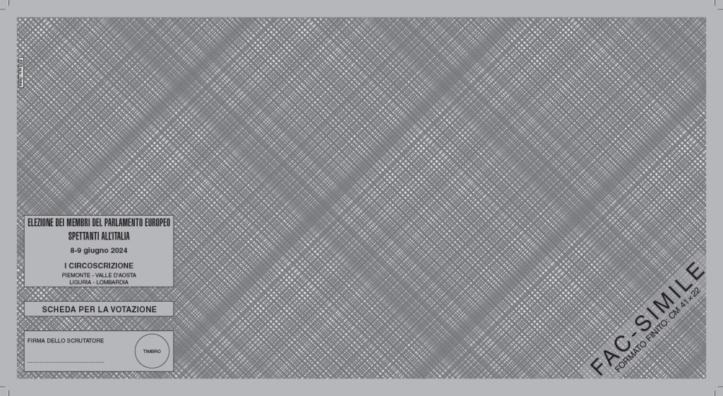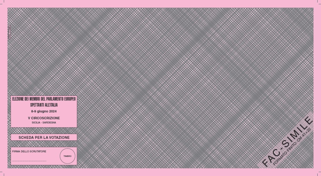 Qui in basso i fac-simile delle schede elettorali per le Elezioni Europee 2024, tipiche per le cinque circoscrizioni, differenziate per colore e ordine di iscrizione dei partiti o raggruppamenti politici che dir si voglia. Sono pubblicati dalla Direzione dei servizi elettorali del Dipartimento per gli affari interni e territoriali.