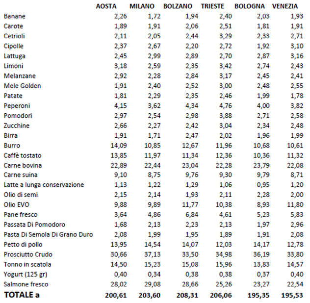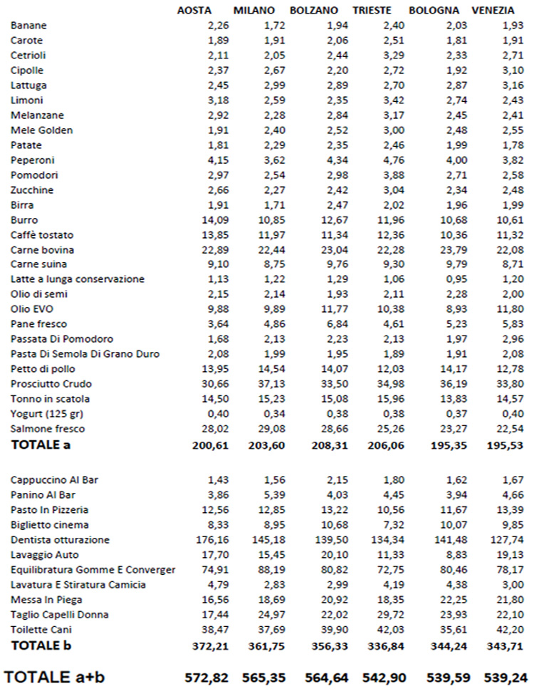 Tanto per capirsi, per lo stesso paniere ad Aosta il costo è di quasi il 58% in più rispetto a quello di Napoli.