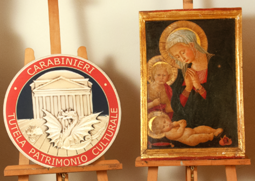 Torna al luogo d’origine un dipinto a tempera su tavola risalente alla seconda metà del XV secolo attribuito allo pseudo Pier Francesco Fiorentino (1444 – 1499), rappresentante la “Madonna del Melograno”. Questa preziosa opera è stata ritrovata dai Carabinieri TPC di Bologna e restituita a Gubbio, in provincia di Perugia.