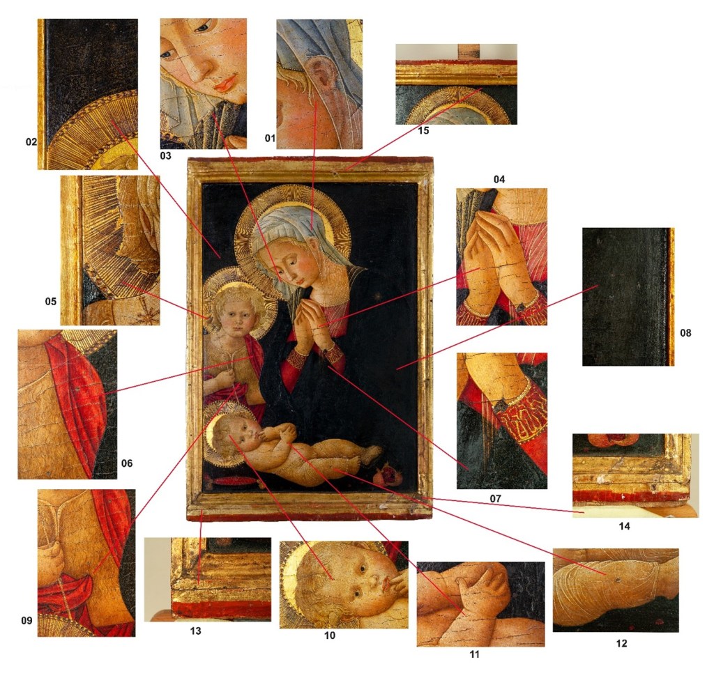 Nell’immediatezza dei fatti, i militari TPC, ottenuta la notizia, si adoperavano ad acquisire presso la Pinacoteca civica di Gubbio un’effige fotografica scattata ad alta risoluzione raffigurante l’opera d’arte prima dell’evento criminoso. Tale attività, in un primo luogo, permetteva di evidenziare ben 14 particolari irripetibili, quali cadute pittoriche, fori di tarlo o danneggiamenti localizzati sulla superficie pittorica dell’opera d’arte asportata che, confrontati sul bene culturale oggetto di informazione permettevano di riscontrare come quest’ultima risultava essere identica, in ogni sua parte, con il dipinto della “Madonna del Melograno”, compendio di furto e oggetto di ricerca.