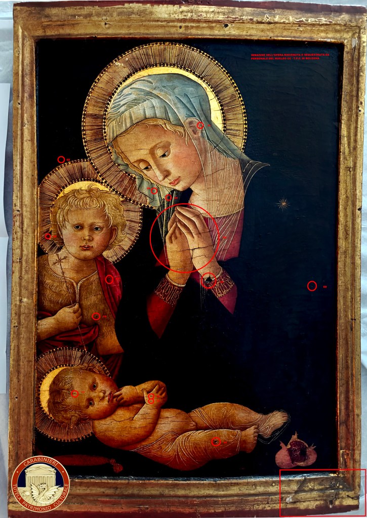 Il dipinto, raffigurante “Madonna del Melograno”, delle dimensioni cm 65 x 44, veniva recuperato dal Nucleo TPC di Bologna nel mese di ottobre del 2024. Un recupero che richiedeva un’attenta e delicata attività di polizia giudiziaria, dettata dal notevole e prestigioso valore del bene d’arte, nell’individuare e ricercare quegli elementi irripetibili, le cosiddette “impronte digitali dell’opera”, al fine di acclarare con certezza che la tavola fosse proprio quella asportata nel 1979.