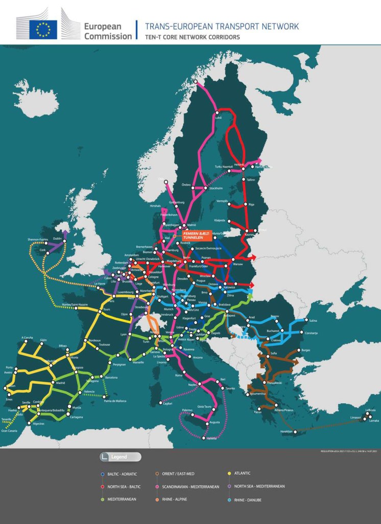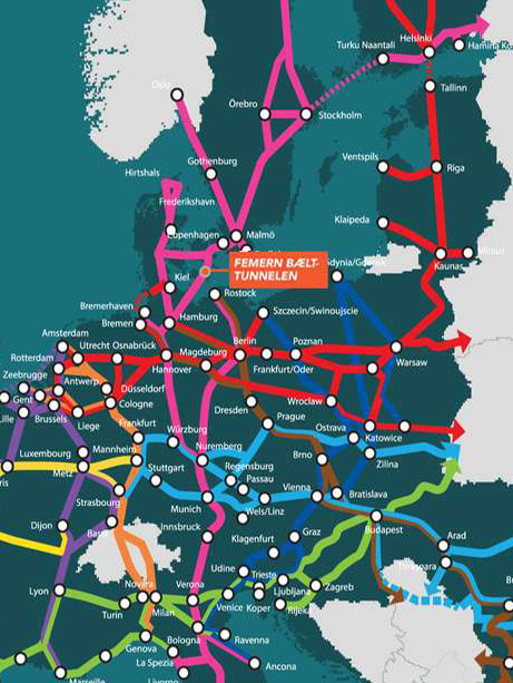 Il tunnel fa parte della cosiddetta rete europea TEN-T fatta di nove corridoi di trasporto attraverso il Vecchio Continente. In particolare il Fehmarnbelt fa parte del corridoio centrale nord-sud da Helsinki in Finlandia a La Valletta a Malta.