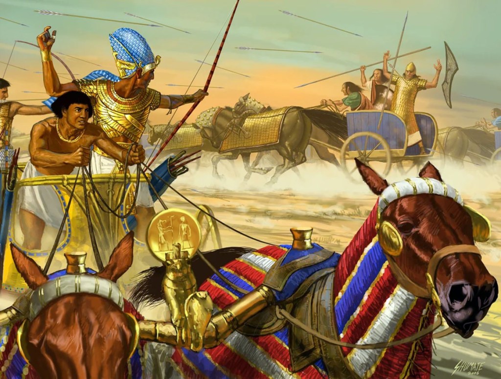 Riorganizzò l’esercito, codificò bene la formazione di squadroni di carri. In breve si trattava di leggere bighe trainate quindi da due cavalli, dotate di un auriga, di un combattente dotato di arco, frecce e lancia.