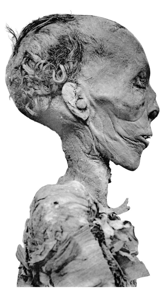 Per esempio il braccio sinistro è spezzato con l’avambraccio tagliato di netto, il braccio destro troncato al gomito, la gamba destra mozzata e segni di squarci nel corpo come fatti con un’ascia o strumento tagliente per frugare dentro e trovare quei preziosi amuleti che in genere erano inseriti al posto di alcuni organi durante il rituale di mummificazione.
