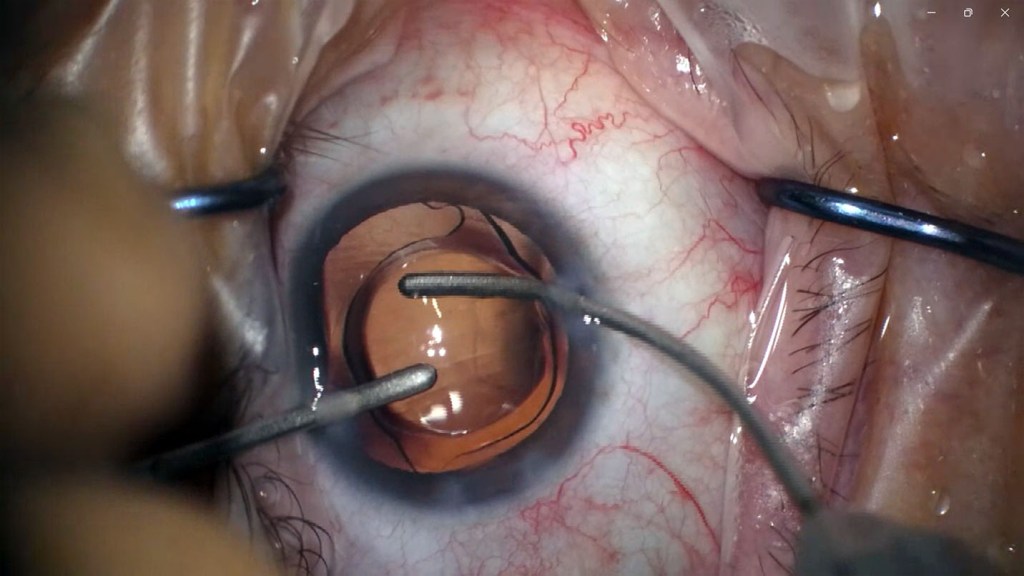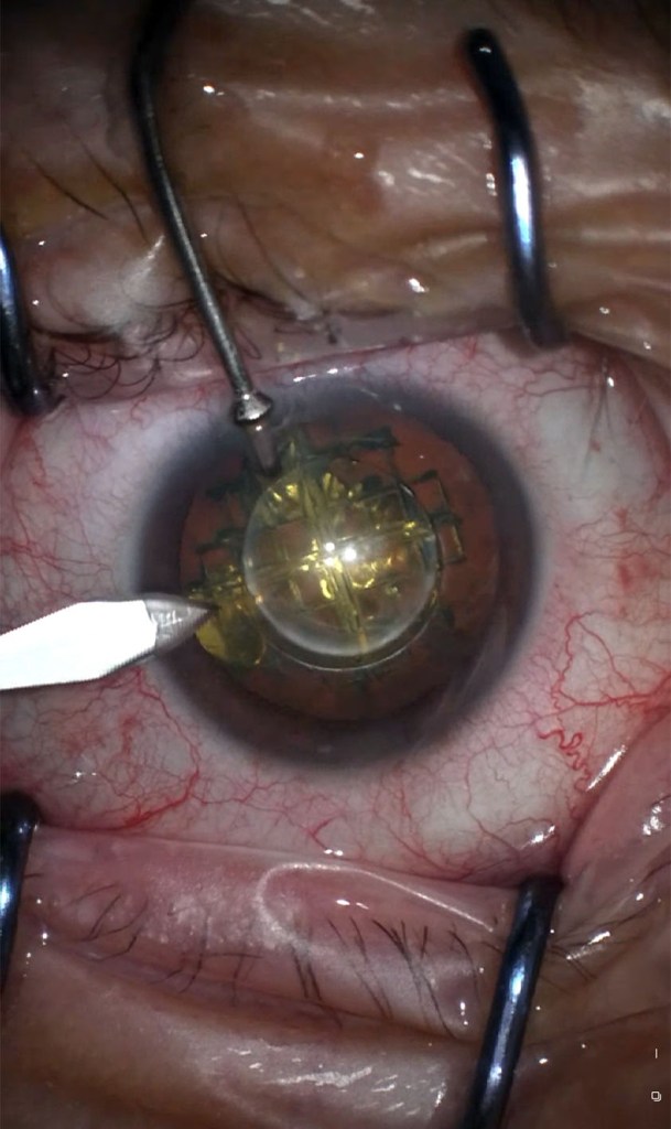 Aspirato via il vecchio cristallino e ripulita per aspirazione quella zona dell’occhio, questa era pronta a ricevere la lente intraoculare premium!