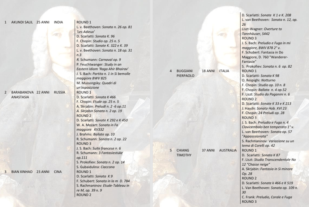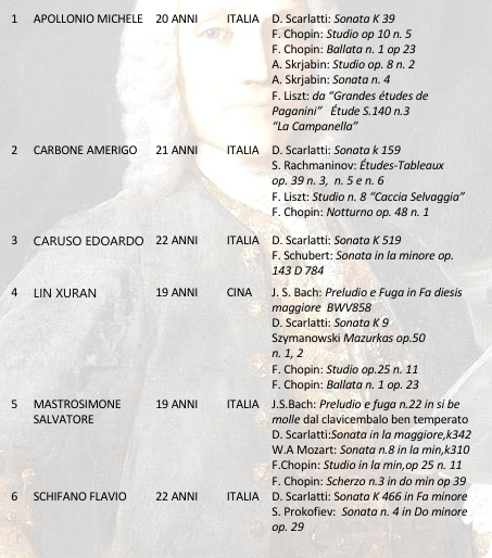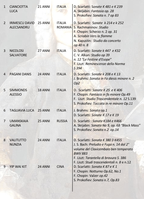 Una giuria internazionale, presieduta dal Maestro Leslie Howard (Gran Bretagna), esaminerà i cinquanta concorrenti arrivati dall’Australia, Cina, Corea del Sud, Germania, India, Messico, Polonia, Romania, Russia, Stati Uniti d’America, Ucraina e, naturalmente, Italia.