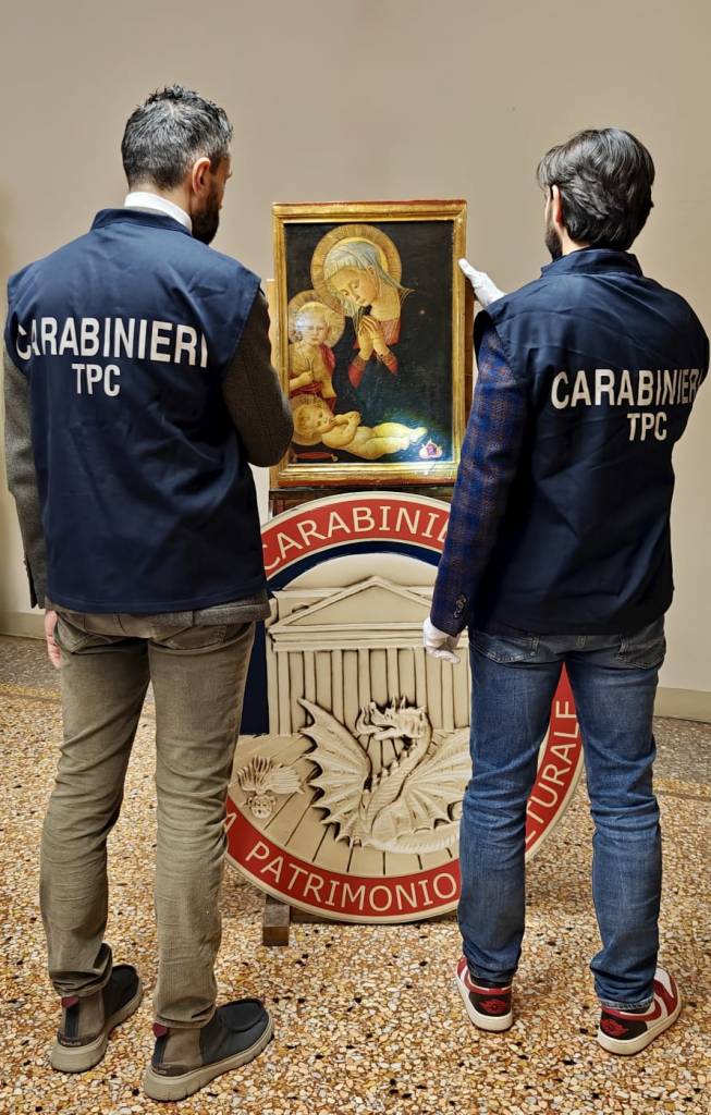 – 10 ottobre 2024 (Imola-BO), quando il Nucleo TPC di Bologna ha sequestrato un dipinto raffigurante la “Madonna con Bambino e San Giovannino,” (articolo) detta Madonna del Melograno (tempera su tavola – 65×44 cm), attribuita a Pier Francesco Fiorentino (1444-1497), che era stata sottratta dalla pinacoteca civica di Gubbio (PG) nella notte tra il 18 ed il 19 marzo 1979.