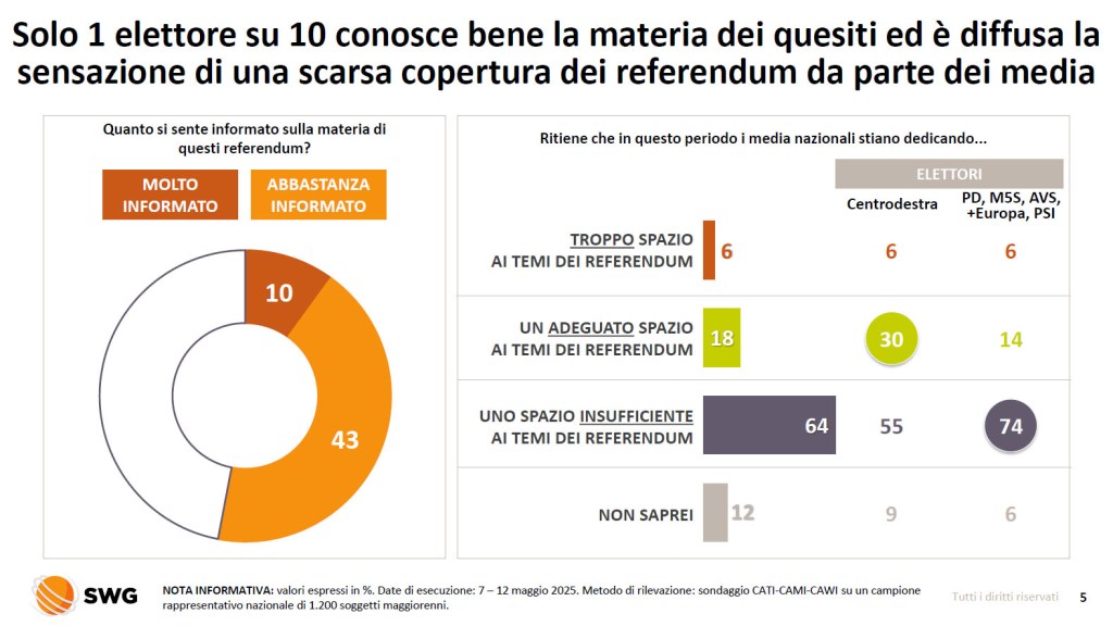 Non ci siamo, sui referendum dell’8-9 giugno il sondaggio SWG evidenzia molti punti critici. In breve, la gente non trova informazioni su questo passaggio al voto, non trova dati soddisfacenti e in maggioranza critica l’invito al non voto/astensione dal recarsi alle urne rivolto da alcuni esponenti politici. Da sottolineare che queste risposte sono date anche da coloro che voteranno “NO” dai quesiti referendari. Per adesso, secondo il sondaggio, il Quorum per la validità del voto non è raggiunto: interpellando la gente si è ancora lontani dalla soglia del 50% più uno, non si va oltre la fascia compresa fra il 32% e il 36% dei votanti.