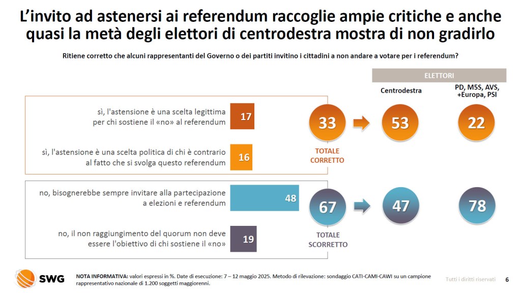 Le sollecitazioni al non voto “non sono state accolte bene dai cittadini, buona parte dei quali pensa che i rappresentanti di partiti e istituzioni dovrebbero sempre promuovere la partecipazione al voto. Appare significativo che a rivelarsi contrariata rispetto agli inviti all’astensione è anche quasi la metà degli elettori di centrodestra”.