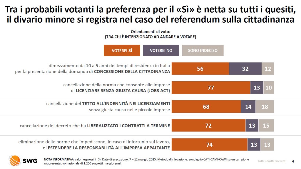Tornando ai diversi argomenti del sondaggio, come sottolinea SWG, conseguenza della situazione è che ad andare a votare sono principalmente i sostenitori dei “SI” che prevale in misura netta su tutti i 5 quesiti. Tuttavia, il referendum sulla cittadinanza sembra l’unico ad attrarre alle urne anche un gruppo più corposo di contrari all’abrogazione, seppure essi rimangano sempre in minoranza.