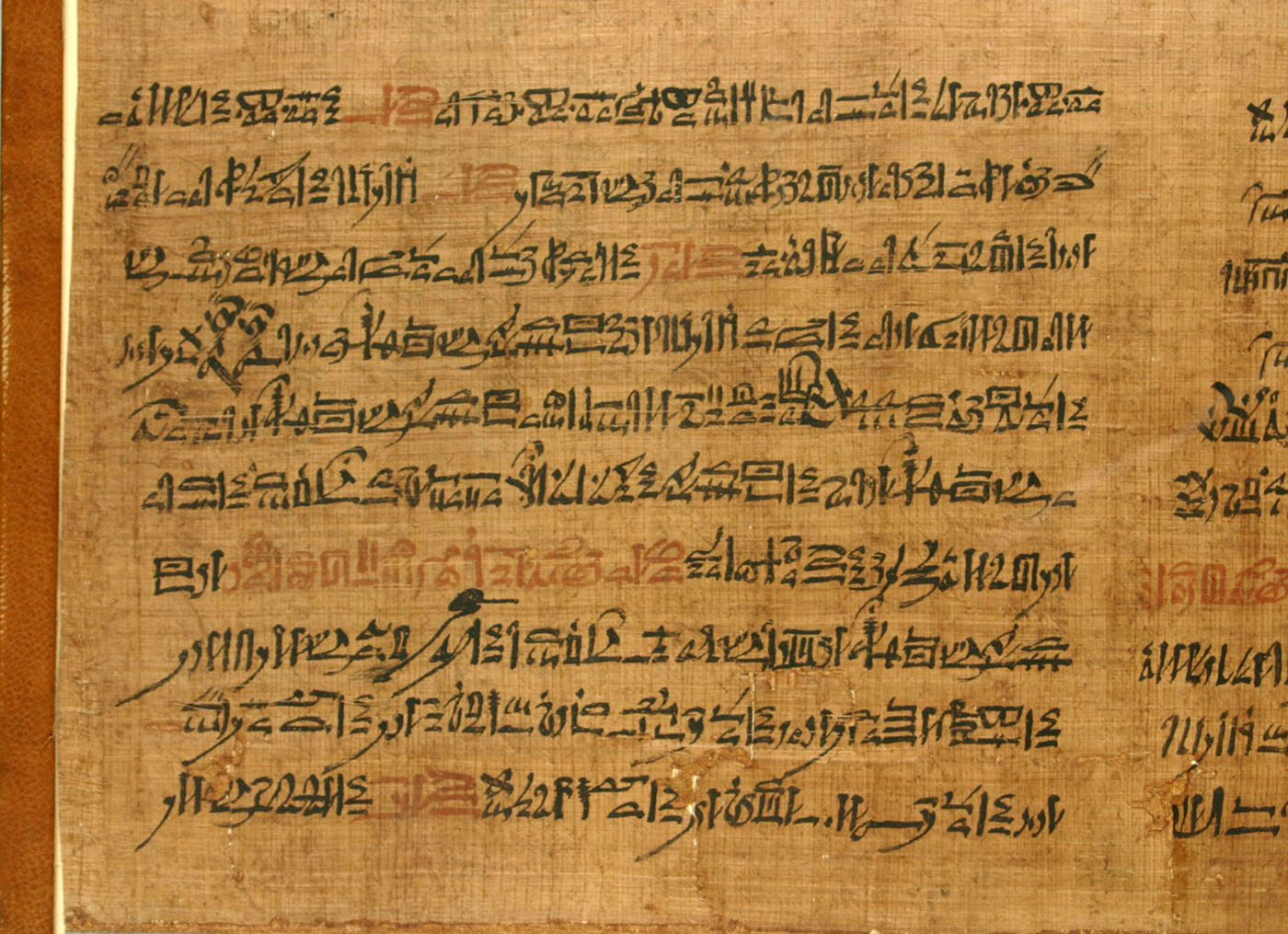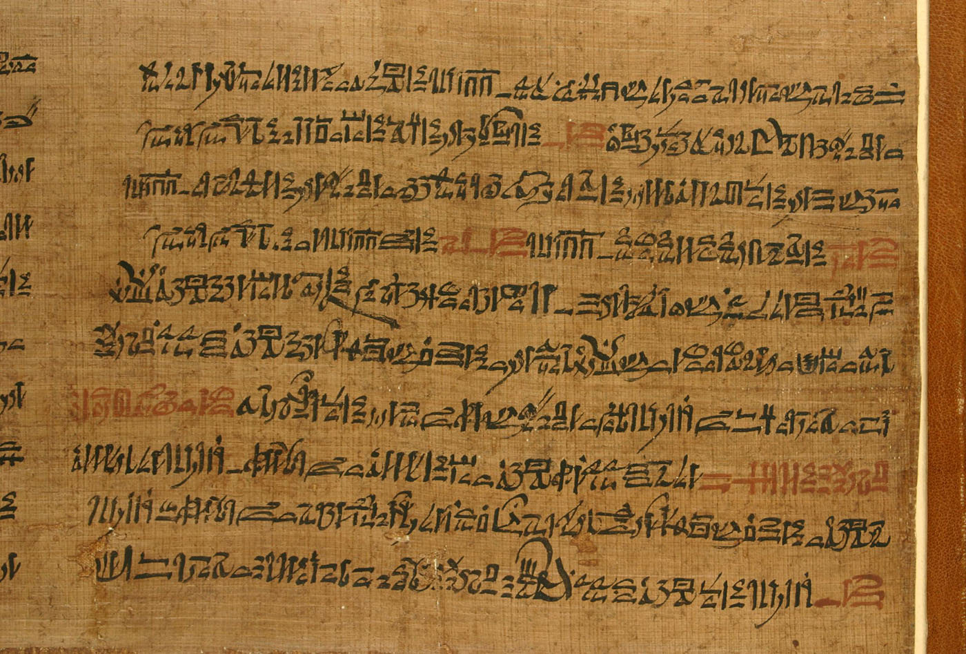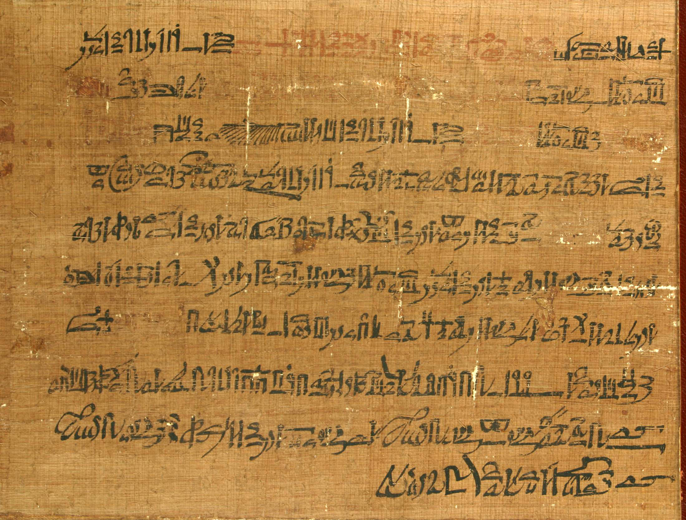 L’antico letterato usò la scrittura Ieratica, una sorta di corsivo nell’Antico Egitto, una semplificazione dei classici geroglifici, una grafia adatta a chi doveva scrivere più rapidamente documenti e archivi. Per tracciare i caratteri si usava un calamo fatto con una piccola canna di bambù tagliata: la punta veniva intinta nell’inchiostro nero o rosso, quest’ultimo per far risaltare nomi o altri elementi come sottolineare parole importanti, una data, l’incipit di un nuovo capitolo, ma anche delle correzioni.
