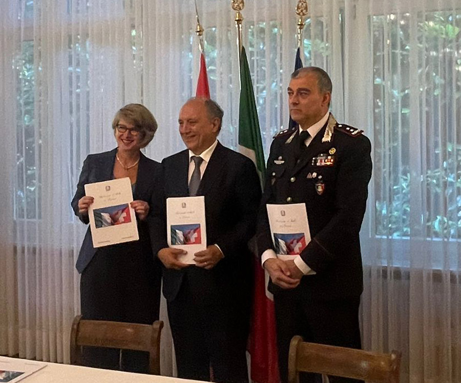 Nella rappresentanza diplomatica l’Ambasciatore Gian Lorenzo Cornado ha accolto il Generale di Divisione Francesco Gargaro, Comandante del Comando Carabinieri per la Tutela del Patrimonio Culturale (TPC), durante la cerimonia per la restituzione allo Stato italiano di 48 beni culturali confiscati durante procedimenti penali elvetici o provenienti da spontanee consegne di cittadini svizzeri che erano in possesso degli antichi manufatti.