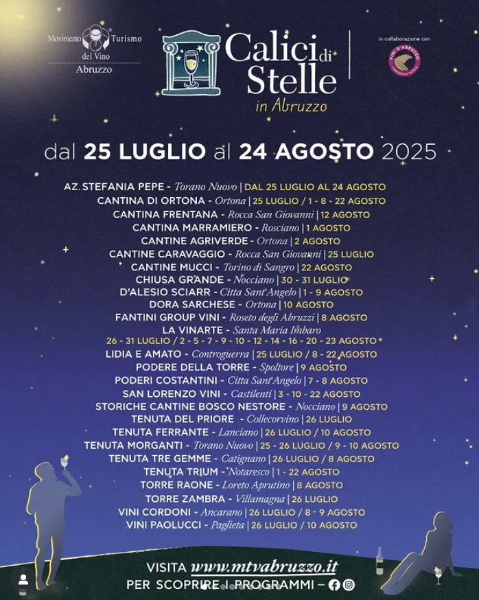 Luoghi di ogni tipo immersi nei paesaggi e nei territori più incantevoli d’Italia, è iniziato in molte cantine del Bel Paese il consueto e celebre evento Calici di Stelle, edizione 2025, che grazie al lavoro comune di MTV-Movimento Turismo del Vino e dei pizzaioli di AVPN-Associazione Verace Pizza Napoletana ha portato all’unione del vino e della pizza. Naturalmente, tutti a rimirar le stelle che in questo periodo dell’anno regalano uno spettacolo unico arricchito dalle stelle cadenti agostane.