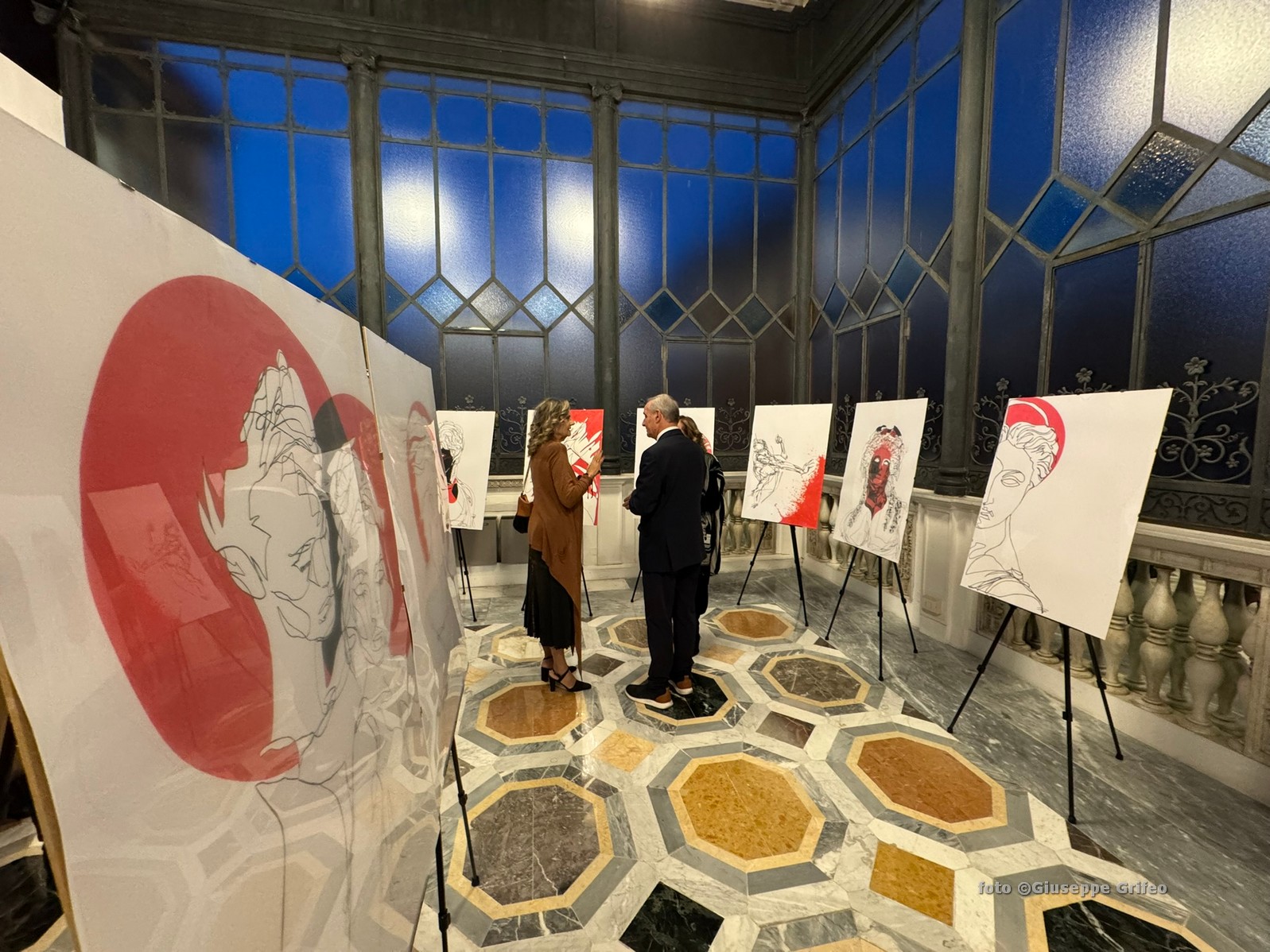 Linee continue di inchiostro nero di china, sinuose, misteriche, eleganti, poi esplosioni di colori, dal blu al rosso, in raggi, in onde che trafilano dalle linee, che completano caratteri, emozioni, miti del passato, trasfigurano e profilano fisionomie, corpi. L’artista e pittore siciliano Sergio Di Paola ha esordito a Roma con la sua personale Numina – il palpito del Passato, la ricerca dell’Identità per la decima edizione del Rome Art Week. Un appuntamento capitolino avvenuto a ottobre e accolto nel giardino d’inverno di Palazzo Tittoni messo a disposizione dal Duca Luigi Catemario Tittoni di Quadri.