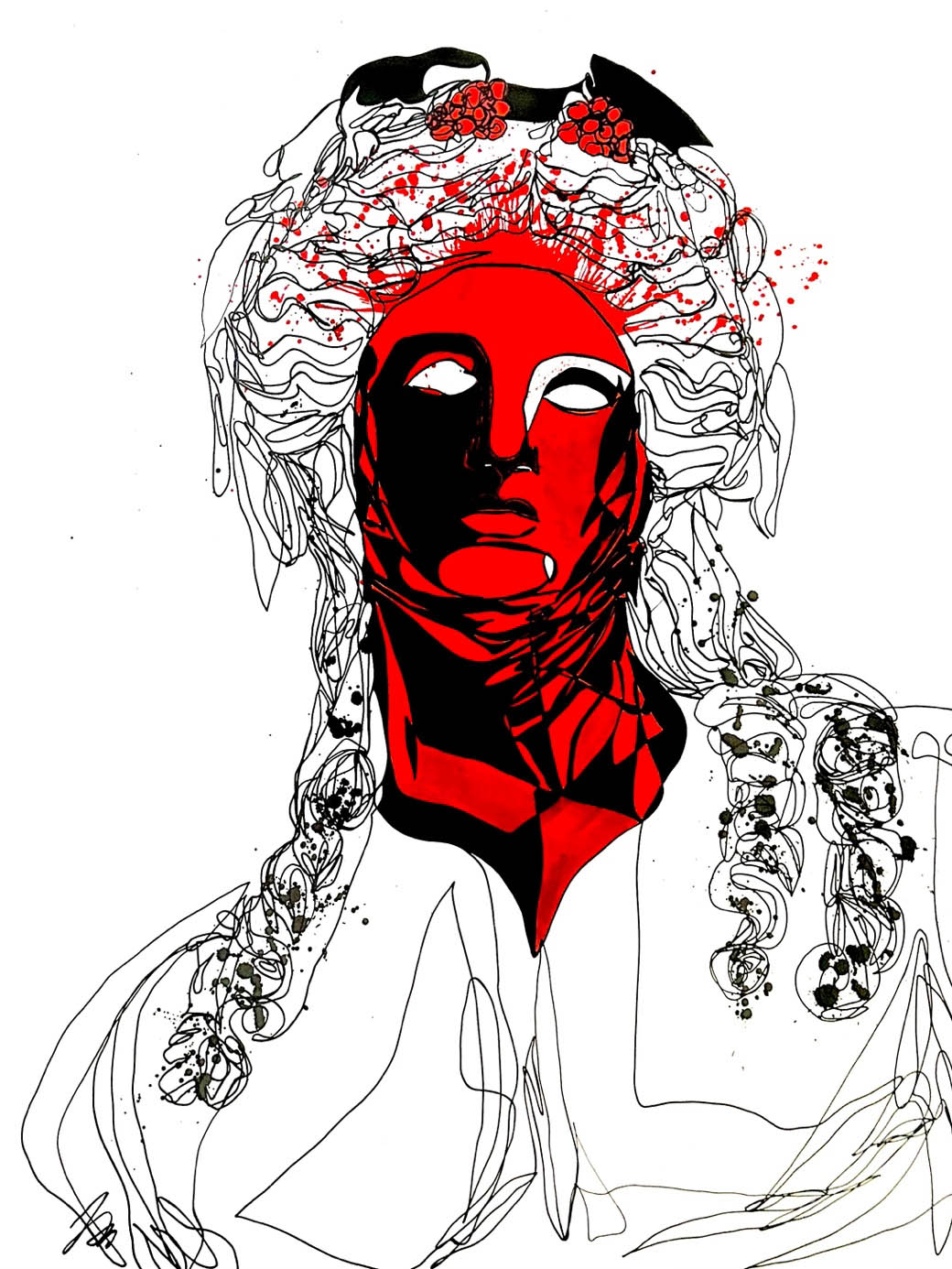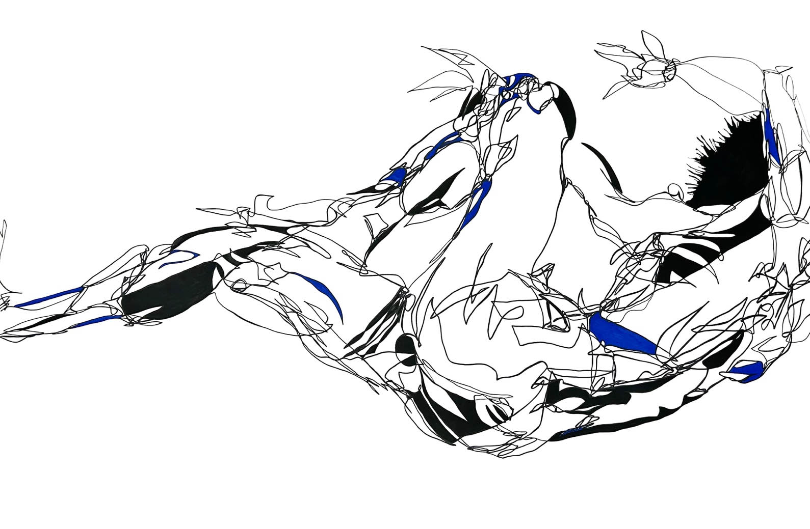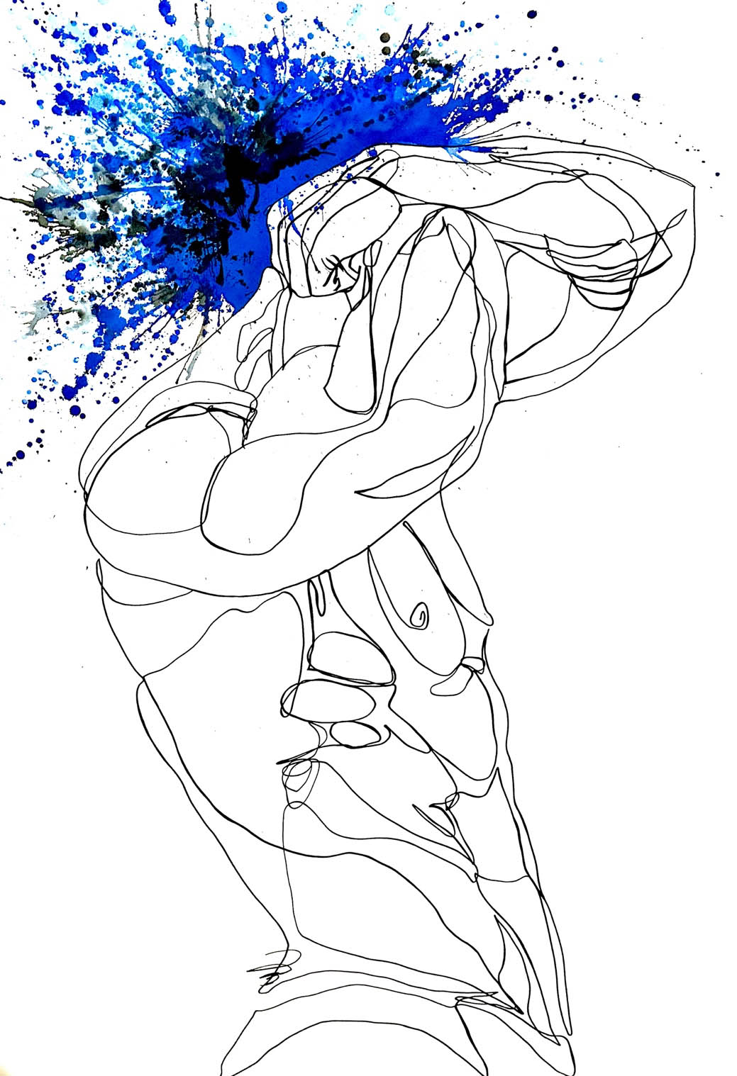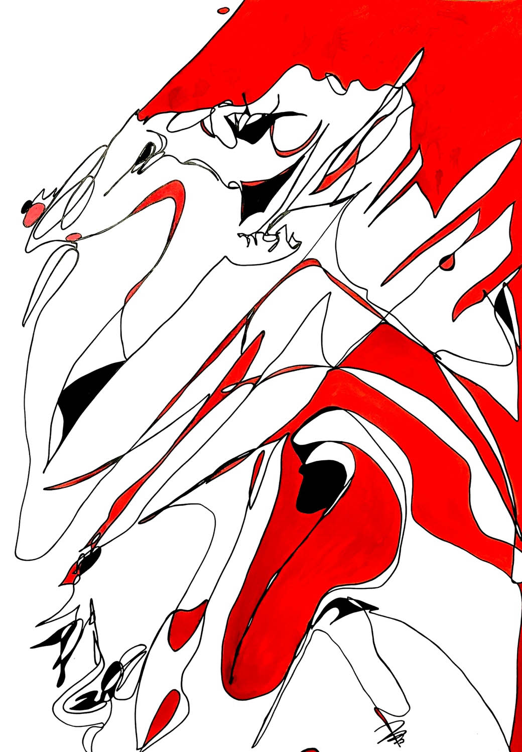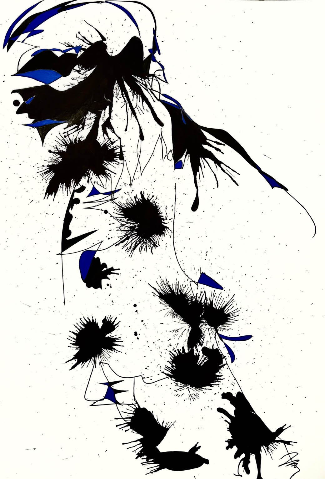 Da qui il bianco candido di grandi fogli, il nero assoluto dell’inchiostro di china e colori assoluti a rappresentare esplosioni dell’anima.