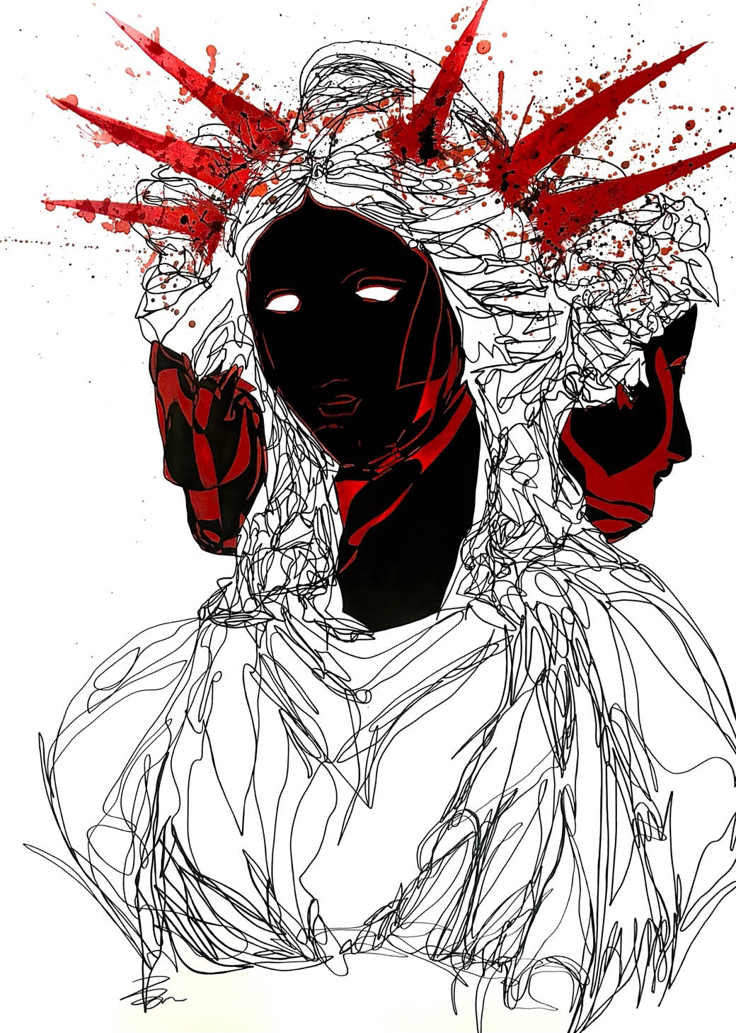 “La mia ricerca esplora la tensione tra visibile e invisibile, tra caos e ordine – racconta Sergio Di Paola – Affido all’inchiostro di china il ruolo di medium espressivo e varco interiore: nel contrasto assoluto tra bianco e nero, il segno incide il vuoto, mentre rosso e blu irrompono come presenze archetipiche sospese tra memoria e oblio, tra eco e silenzio dove l’inchiostro diventa materia viva della metamorfosi del divino. Le opere presentate in NVMINA sono per me emblemi di questo percorso. Realizzarle ha significato affrontare una sfida personale e creativa: abbandonare i formati contenuti a cui ero abituato per misurarmi con dimensioni più ampie in tempi ristretti. Questo mi ha portato a riconsiderare il rapporto con lo spazio e con la fisicità del gesto”.