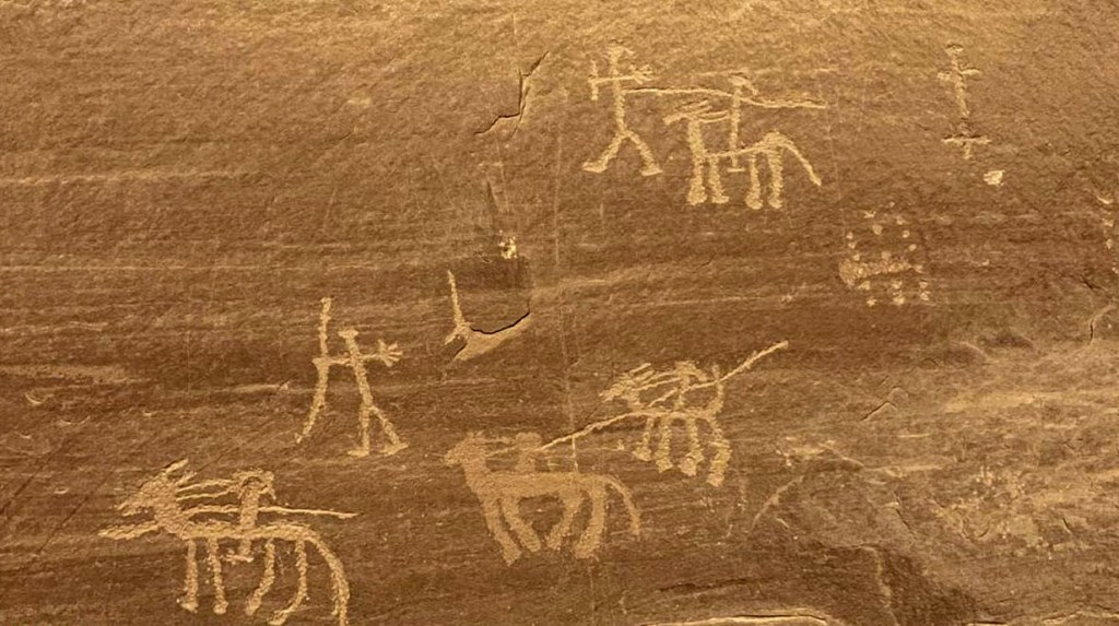 Ci sono anche immagini che raffigurano un arciere che usa l’arco per cacciare i lupi, accompagnato da una serie di segugi, una scena che riflette gli stili di vita e le attività economiche delle prime società umane.