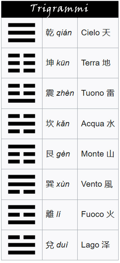 La leggenda sulla comparsa degli scritti dell’I-Ching – Gli otto trigrammi (八卦) dell’I-Ching non sono ideogrammi. Sono sequenze di linee (爻) intere (阳爻) e spezzate (阴爻): le linee continue rappresentano lo Yang, mentre quelle interrotte lo Yin, due forze opposte però complementari, interdipendenti, in costante equilibrio dinamico nel Taijitu, cerchio diviso in bianco e nero; hanno radice uno nell’altro, hanno origine reciproca, l’uno non può esistere senza l’altro.