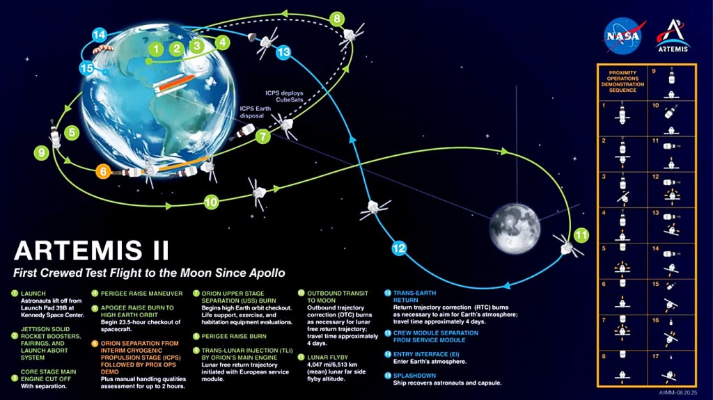 Gli astronauti svolgono adesso i vari compiti in programma, stanno facendo test necessari passando al comando manuale della capsula Orion in modo da verificarne l’effettiva manovrabilità e precisione, risolvono eventuali problemi tecnici, cambiano quota nello spazio prima della rotta finale verso la Luna.